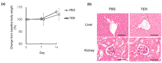 Synthetic (+)-terrein showed no toxicity. (a) Effect on body weight. Changes in the body weight of control mice from baseline to 7 and 14 days after the start of the experiment were observed as relative values (mean ± standard deviation: SD) of the baseline body weight (100%) at the start of the experiment (N = 4). Error bars: SD. (b) Effects on the liver and kidney. Histological and morphological changes were observed by hematoxylin and eosin (HE) staining of livers and kidneys harvested 14 days after the start of the experiment in control mice. A representative image (N = 4) is shown. Scale bar: 200 µm (at 200× magnification) PBS: control mice treated with phosphate-buffered saline (PBS); TER: control mice treated with synthetic (+)-terrein. Student’s t-test was used for statistical analysis.