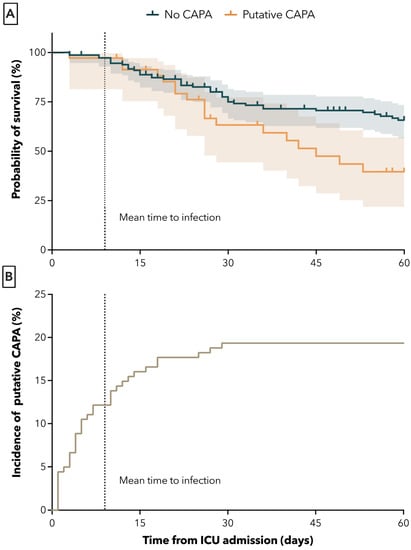 The 60-day all-cause mortality from ICU admission was significantly higher in the CAPA group. Death at 60 days occurred in 18 of 35 (51.4%) of patients with CAPA and in 43 of 146 (29.5%) patients without CAPA (adjusted HR (95% CI) = 2.15 (1.20–3.86, p = 0.002). The unadjusted HR was 1.97 (95% CI 1.13–3.42), p = 0.01) (Figure 2A). The mean time from ICU admission to time of CAPA diagnosis was 9 ± 8 days (Figure 2B).