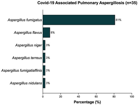 The relative frequencies of identified aspergillus species in microbiological cultures of BAL samples are depicted in Figure 3. The most commonly identified Aspergillus species was Aspergillus fumigatus, which was found in 30 of 35 (85.6%) patients diagnosed with CAPA. Aspergillus flavus was found in three (8.6%) cases. One case each of Aspergillus niger, Aspergillus terreus, Aspergillus fumigatiaffinis, and Aspergilllus nidulans were identified (2.9%). One patient had a co-infection with three Aspergillus spp. (A. Flavus, A. Fumigatus, and A. Niger).