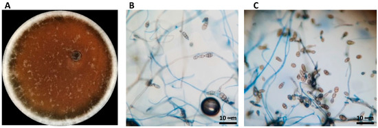 Morphological identification of Alternaria alternata. (A) A. alternata grown in PDA broth for 7 days at 28 °C. (B,C) Observations under phase-contrast light microscope magnification 60×.