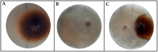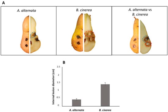 Since studies on the toxins secreted by A. alternata detected the presence of unselective toxins, the same experiment performed in paragraph 3.4 was conducted in non-host pear fruits using the Italian cultivar of pear fruits Decana del Comizio. As shown in Figure 5A, the external appearance of lesions is visible as a black area with A. alternata, and a brownish area with B. cinerea. The external injuries extended from 0.5 to 2 cm from the inoculation point (Figure 5B), and the internal injuries from 0.8 to 2.4 cm (Figure 5C). In this case, B. cinerea was more phytotoxic than A. alternata. The co-inoculation of both fungi on the pear fruits confirms the previous data observed in Figure 3. A. alternata in the presence of B. cinerea showed a competitive exclusion during the co-inoculation, inhibiting the growth of B. cinerea by about 65%.