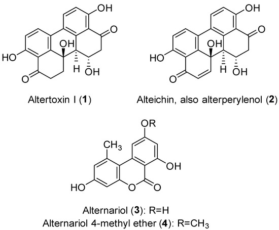 Altertoxin I (1), alternariol (3) and alternariol 4-methyl ether (4) are among the most common mycotoxins produced by Alternaria spp., and can be found as contaminants of foodstuffs [45,46]. Alteichin (2) or alternariol (3) have been described as reddish pigments [47]. Compounds 1 and 2 are perylenequinones, a family of natural products whose structure is characterized by a pentacyclic conjugated chromophore that provides light-induced biological activity [48]. The biological activities of perylenequinones have been widely studied in the pharmacological field. Eighty-five percent of the already-known perylenequinones have been discovered from fungal sources, though they have also been found in plants and animals [49]. Altertoxin I (1) and alteichin (2) are produced by different Alternaria species, including fungal pathogens, and phytotoxic activities have been reported for both compounds [45,50,51]. Alternariol (3) and alternariol 4-methyl ether (4) are dibenzopyrone derivatives, tricyclic aromatic compounds commonly produced by Alternaria species [45]. These compounds are mycotoxins that are frequent contaminants in foodstuffs, though the toxicity of alternariols for humans and animals is considered low [52,53]. There are several reports in the literature that have focused on pharmacological activities and biosynthetic aspects of compounds 3 and 4, and some studies have shown activities of agronomic interest for both toxins [52,54,55].