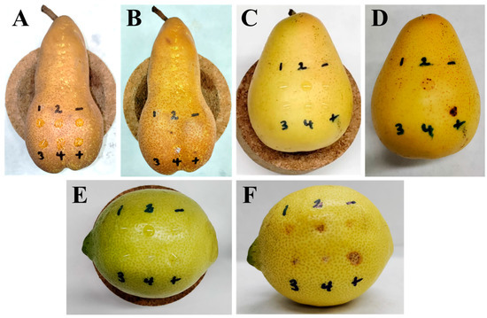 Necrotic effects produced by compounds 1–4 (tested at 5 × 10−3 M), the positive control epi-pyriculol (+) (tested at 5 × 10−3 M), and the negative control (-) (4% DMSO in distilled water), on Abate Fetel pears after 0 (A) and 3 (B) days; on Decana del Comizio pears after 0 (C) and 3 (D) days; and on lemon fruits after 0 (E) and 3 days (F).