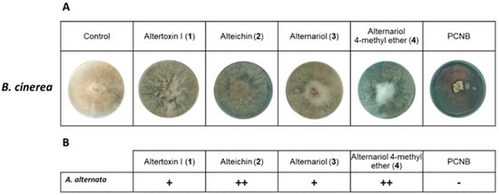 The unselective toxins (1–4) isolated from A. alternata were tested for their antifungal activities to investigate their involvement in inhibiting the growth of B. cinerea observed in the previous experiments. As a positive control, the commercial fungicide pentachloronitrobenzene (PCNB) was employed. The concentrations tested were those used in the experiment represented in Figure 7.