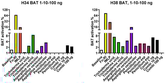 Result of two subjects’ positive basophil activation BAT tests: Baseline is without an activation stimulant. FcεRI is the IgE response positive control; fMLP is the non-IgE-mediated positive control. The protein concentrations of the stimulating microbes used here were 1, 10, or 100 ng, respectively, from each strain tested. Combi signifies the combination of all three different strains; Combi 1 ng refers to each mold strain at a final concentration of 1 ng/tube, Combi 10 represents 10 ng/tube, and in Combi 100, the final concentration of all three strains was 100 ng/tube. A positive response can be considered when the BAT activation is about 2–3 times higher than that measured in the baseline tube. One exposed subject (H34) displayed an impressive dose response to Trichoderma, while for the other exposed subject (H38) the same doses became too toxic. This figure presents only those two exposed subjects in whom the stimulation reaction to a mold was positive. In all the other exposed subjects, results with the six mold strains examined in this study showed no evidence of basophil activation.