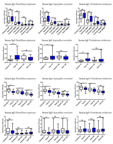 Serum immunoglobulin Ig responses against extracts of Penicillium expansum, Aspergillus versicolor, and Trichoderma viridescens. Boxplots indicate median values with 95% confidence intervals; statistically significant * p < 0.05, ** p < 0.01, *** p < 0.001 and **** p < 0.0001 when the study persons were compared to controls. Ns = non-significant.