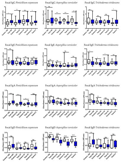 Fecal Ig responses against extracts of Penicillium expansum, Aspergillus versicolor, and Trichoderma viridescens. Test = exposed subjects from the target, toxic building; control = unexposed subjects. It is commonly known that IgA plays a marked role in intestinal immunology, but there were nonsignificant IgA levels against A. versicolor and T. viridescens strains. The IgG and IgD results of A. versicolor revealed markedly reduced responses in the exposed subjects. Note that the protein dilutions of the fecal samples are 100, 33, 10, and 0.3 µg/mL. Boxplots indicate median values with 95% confidence intervals; statistically significant * p < 0.05, ** p < 0.01, *** p < 0.001 and **** p < 0.0001 when the study persons were compared to controls. Ns = non-significant.