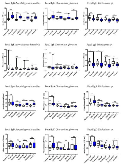 Fecal Ig responses against A. luteoalbus, C. globosum MTAV35, and Trichoderma sp. (=atroviride 14/AM). Fecal IgG levels of both A. luteoalbus and C. globosum MTAV35 were increased in exposed subjects. With respect to Trichoderma sp. IgE values, the extensive variation complicates the interpretation but the variation in the results is not attributable to a single study subject. Boxplots indicate median values with 95% confidence intervals; statistically significant * p < 0.05, ** p < 0.01, *** p < 0.001 and **** p < 0.0001 when the study persons were compared to controls. Ns = non-significant.