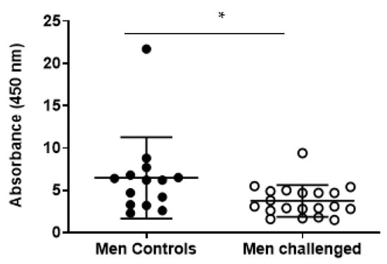 From the assay results, differences between the two groups of subjects’ immunoglobulin scores were calculated using the Student T test and the nonparametric Mann–Whitney test with the GraphPad Prism program. At each dilution, only the exposed vs. controls were compared.