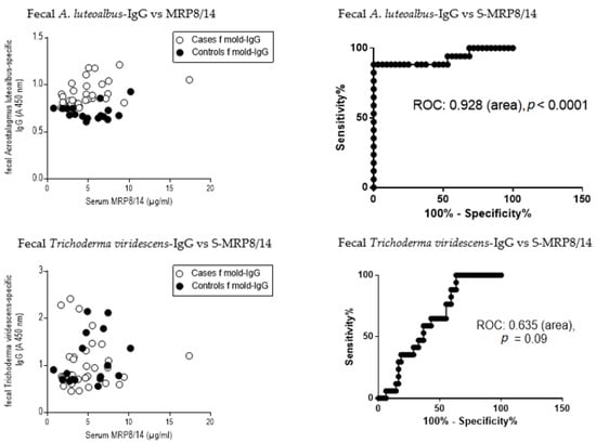 Receiver operating curves ROC results of fecal IgG vs. inflammatory marker MRP8/14 (calprotectin), when fecal coating is 100 µg/mL. The ROC curve analyses indicated the diagnostic performance of the specific Ig against the subject’s inflammation status, as determined by MRP8/14 levels. The best resolution results of microbial-specific Igs are evident in Figure 5 and the poorest resolution result in Figure 3. The best resolution result of Figure 5 from the first row on the left (fecal A. luteoalbus-specific IgG) was plotted against the concentration of MRP8/14, a marker of inflammation, in exposed subjects (open circles) and controls (black circles). On the top right-side is the ROC curve with the specificity and sensitivity calculated. The lower row shows as an example of how the respective results of T. viridescens-specific fecal IgG results do not distinguish mold-exposed subjects from controls (Figure 2 right top), and the ROC curve value is in line with the conclusion that fecal T. viridescens-specific IgG results were of no value when evaluating whether the subject had been exposed to harmful toxins.