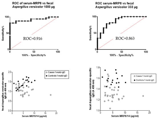 Since fecal extracts have not been studied with ELISA methods in general, whether a higher concentration of the microbial extract would improve these fecal ROC results was tested in the coating (Figure 8). When the protein extract of A. versicolor was coated with 100 µg/mL and the IgD responses of the fecal extract were tested, the ROC curve was 0.723. The respective results from fecal A. versicolor-specific IgD and serum MRP8/14 provided a ROC value of 0.916 when the mold extract was increased to 1000 µg/mL and 0.863 when the coating level was 333 µg/mL. However, as the separation was based on the microbe-specific Ig results, and MRP8/14 levels played a rather modest role in general, it does seem probable that these results would not be helpful in the diagnosis of mold exposure in the future.