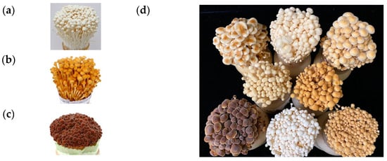 Figure 1. Color of the fruiting bodies of Flammulina velutipes strains. (a) F. velutipes white strain; (b) F. velutipes yellowish-brown strain; (c) F. velutipes dark-brown strain; (d) various colors of F. velutipes strains.