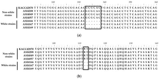 Figure 2. Alignments of phenylalanine ammonia-lyase 1 (Fvpal1) genes of Flammulina velutipes strains. (a) cDNA sequences; (b) amino acid sequences. Boxes indicate the variation sites of the Fvpal1 gene. The white strains of F. velutipes showed a deletion of GCGCAC (112RT113; arginine and threonine) in the Fvpal1 gene.