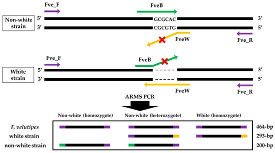 Figure 3 shows the scheme of ARMS PCR primer design to detect the specific variation ΔGCGCAC in the Fvpal1 gene and to discriminate the fruiting body color of F. velutipes. A four-primer set was designed to amplify all F. velutipes, non-white, or white strains (Table 2). The FveF and FveR primers were expected to amplify the 464 bp product from all F. velutipes strains. In addition, the FveF/FveW and FveR/FveB primer sets were expected to amplify 293 bp and 200 bp products for F. velutipes white and non-white strains, respectively.
