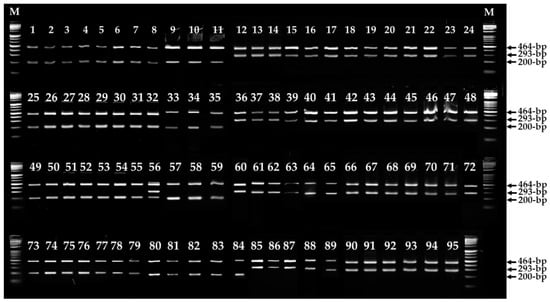 Figure 4. Amplification refractory mutation system (ARMS) PCR of Fvpal1 in 95 Flammulina velutipes strains (Table 1). Non-white and white strains of F. velutipes showed 464 bp and 200 bp, 464 bp and 293 bp PCR products, respectively. A heterozygous strain (No. 56, F. velutipes ASI4175) showed all three amplification products: 464 bp, 293 bp, and 200 bp. M, size marker (1 kb ladder, TNT Research).