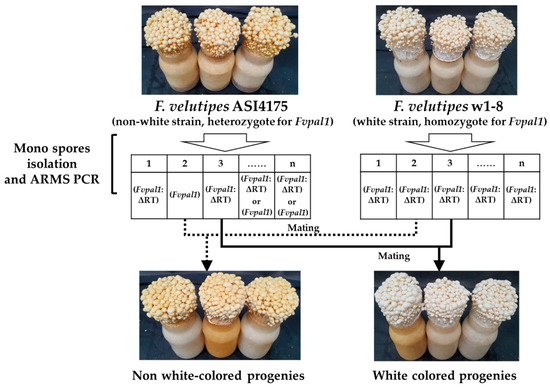 In this study, comparative genomics of six F. velutipes strains showed 70 variations unique to white strains, including SNPs and indels. Of these, 36 were found in open reading frames and only one caused a disruptive in-frame deletion (ΔGCGCAC) in the Fvpal1 gene, resulting in the deletion of two amino acids (arginine and threonine) at positions 112 and 113. Specific primers were designed to detect this mutation, and PCR analysis of 95 F. velutipes strains revealed that this mutation was present only in white strains. In addition, monospores of the heterozygous mutant were isolated, and a mating assay was performed to evaluate the mutation’s relationship to fruiting body color. As a result, progeny resulting from mating monospores with and without the ΔGCGCAC deletion in the Fvpal1 gene showed non-white fruiting bodies. However, mating monospores with the mutated Fvpal1 gene resulted in progeny with only white-colored fruiting bodies.