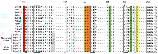In this study, two PAL genes, Fvpal1 and Fvpal2, were identified in the genome of F. velutipes. No mutations were found in the sequence of the Fvpal2 gene (Figure S3). As shown in Figure 7, the fruiting body color-related mutation Δ112RT113 was not found in the Fvpal2 gene of either non-white or white F. velutipes strains. Motifs essential for the catalytic activity of PAL enzymes were found in Fvpal2 genes. However, substrate-specific residues of Fvpal2 (138MQ139) were found to be different from those of the Fvpal1 gene (160HQ161) but identical to those of the PoPAL1 gene (160MQ161) of P. ostreatus (Figure 6 and Figure 7).