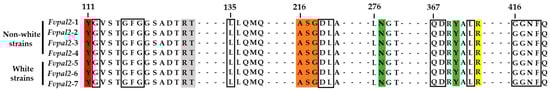 Figure 7. Alignment of the highly conserved domains of phenylalanine ammonia-lyase 2 amino acids of Flammulina velutipes strains. Red: catalytically essential tyrosine residue, orange: the MIO forming amino acid triad, green: amino acid stabilizing MIO group, yellow: arginine responsible for binding the carboxylic group of the substrate, gray: variation site of Fvpal1 gene of F. velutipes, boxes: other conserved catalytic and binding residues. F. velutipes KACC42870 (non-white strain) Fvpal2 (Fvpal2-1), F. velutipes ASI4028 (non-white strain) Fvpal2 (Fvpal2-2), F. velutipes ASI4049 (non-white strain) Fvpal2 (Fvpal2-3), F. velutipes ASI4057 (non-white strain) Fvpal2 (Fvpal2-4), F. velutipes ASI4166 (white strain) Fvpal2 (Fvpal2-5), F. velutipes ASI4157 (white strain) Fvpal2 (Fvpal2-6), F. velutipes ASI4169 (white strain) Fvpal2 (Fvpal2-7).