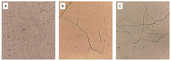 Regarding fungal growth, in static cultures only conidiospores were observed (Figure 1A), whereas there was development of hyphae in shaken cultures that was more abundant at 200 rpm (Figure 1C). Therefore, we selected 200 rpm as the best agitation for consortia to favor fungal growth and still produce high levels of LA, since fungal spores are metabolically inactive [39].