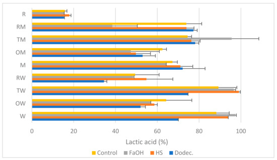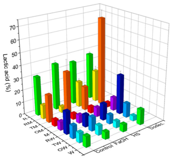 As shown in Figure 2, the production of LA in a control medium with glucose and without added QSMs varied from 15% in R. oryzae (labeled as R in Figure 2) to 98% in L. plantarum WCFS1 alone (labeled as W) and in its consortium with T. amestolkiae (TW); despite most of these differences being not statistically significant, trends could be observed. The effect of supplementing with one of the QSMs was different in each case, although in most cases it was neutral or positive for LA release. The most relevant enhancements were due to farnesol (in W, TW and TM). A clear decrease in LA was observed in the consortium R. oryzae–L. plantarum M9MG6-B2 (RM) with farnesol, the consortium R. oryzae–L. plantarum WCFS1 with dodecanol and L. plantarum WCFS1 alone with dodecanol. R. oryzae was unsensitive to any of the signal molecules.