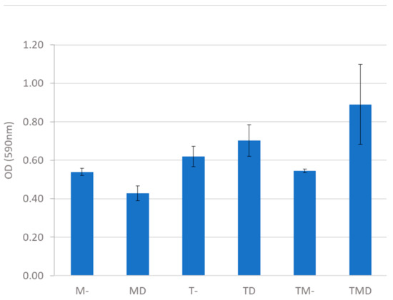 Quantification of biofilm density in MRS medium with starch, induced or not with dodecanol, incubated in a 24-well plate at 28 °C and 200 rpm. T. amestolkiae (T), L. plantarum M9MG6-B2 (M), 100 mM dodecanol (D), without dodecanol (-).