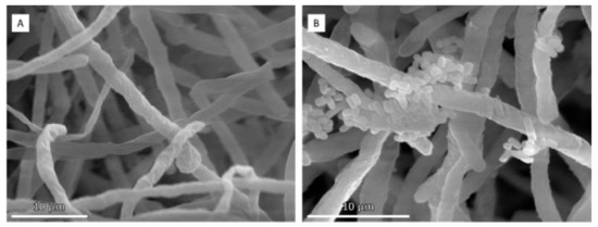 The structure of biofilms was examined by scanning electron microscopy, which allowed observing the adhesion of bacterial cells to fungal hyphae in the presence of dodecanol (Figure 5). This suggests that this QSM may increase the association of both microorganisms.
