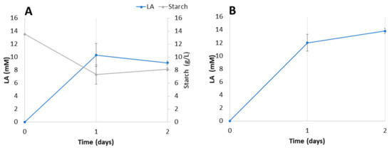 LA production in T. amestolkiae–L. plantarum M9BG6-B2 consortia growing with industrial starch waste (A) or bagasse (B) as carbon sources.