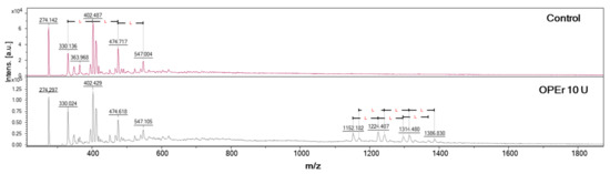 The samples were qualitatively analyzed by MALDI-TOF (Figure 7), which allowed detecting patterns characteristic of oligomers of different lengths resulting from addition of 72 Da, which corresponds to the mass of LA residues. The signals observed in the spectrum of the negative control (without enzyme) were attributed to the Na+ adducts of chains from four (329 Da) to seven LA units (547 Da), as LA naturally forms small chains. However, the spectra of samples treated with OPEr showed bigger LA chains, up to 19-LA units (1386 Da), indicating that the condensation reaction occurred.
