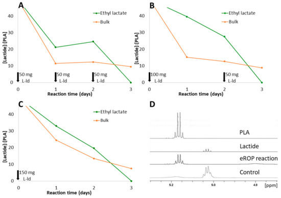 Synthesis of l-PLA via eROP catalyzed by OPEr at 100 °C and 800 rpm. Aliquots of eROP reactions were taken every 24 h and analyzed by 1H-NMR. The signals at 5.0 ppm from lactide and at 5.2 ppm from PLA were integrated to calculate the ratios of their areas. Black arrows indicate addition of l-lactide (L-ld) in 3 pulses of 50 mg of lactide every 24 h (A); in 2 pulses, one of 100 mg at the start of the reaction and a second one of 50 mg at 48 h of reaction (B); or in a single pulse of 150 mg at the beginning of the reaction (C). Region between 5.3–4.7 ppm of the 1H-NMR spectra of commercial PLA, lactide, an eROP reaction (procedure B in ethyl lactate, t = 3 days) and a control without enzyme (D).