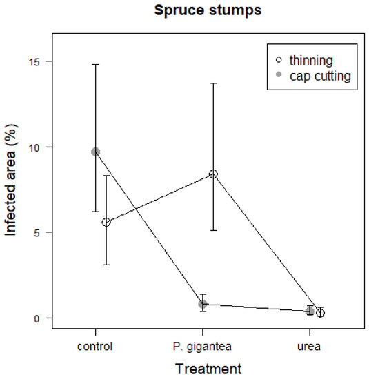 A total of 47.5% of pine stumps treated with P. gigantea and 1.4% of pine stumps treated with urea were infected by Heterobasidion spores. Correspondingly, in spruce stands, 71.2% of P. gigantea-treated and 59.5% of urea-treated stumps were infected by Heterobasidion sp.