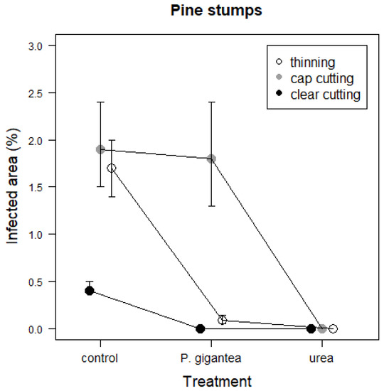 In the clear-cut pine stands, the proportion of infected area was lower in the P. gigantea and urea treatments than in the control (Table 3, Figure 2). In the controls of cap cutting and thinning, the infected areas were larger than in the control of clearcutting. In the P. gigantea treatment of cap cutting, the proportion of infected area was larger than in clear-cutting and thinning. In the urea treatment, the infected area was low in all harvesting methods.