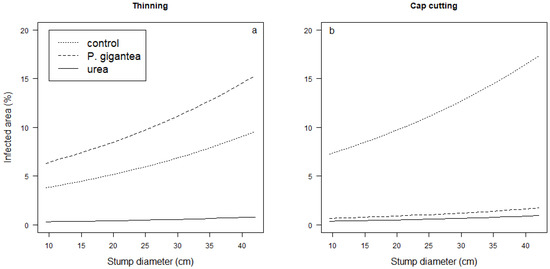 Area covered by Heterobasidion sp. (%) in spruce stumps as a function of stump diameter in different treatments (control, P. gigantea, or urea) after (a) thinning and (b) cap cutting. Predicted values based on linear mixed models have been used to draw the figure.