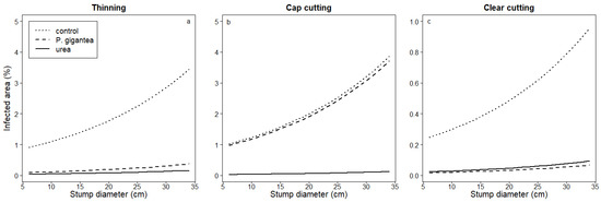 Area covered by Heterobasidion sp. (%) in pine stumps as a function of stump diameter in different treatments (control, P. gigantea, or urea) after (a) thinning, (b) cap cutting, and (c) clear-cutting. Predicted values based on linear mixed models have been used to draw the figure.