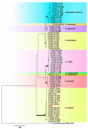 Fungal genomic DNA of the strain LW09 was extracted from mycelia on a potato dextrose agar medium (PDA) using a previously published method [17]. For molecular analysis, the internal transcribed spacer (ITS), beta-tubulin (BenA), and calmodulin (CaM) regions were amplified using primer pairs ITS1 and ITS4, Bt2a and Bt2b, and cmd5 and cmd6, respectively [17]. PCR reactions were prepared following the published method [17]. Sequencing reactions were performed by Tsingke Biotechnology Co., Ltd., Beijing, China. All the sequences generated in this study were deposited in GenBank (ITS OP250138.1, BenA OP584347, and CaM OP584348). To determine the phylogenetic relationships of LW09, analysis was performed based on the three loci. Alignments were generated and manually edited by MEGA X (MUSCLE). Alignments of each locus were concatenated and used in the subsequent phylogenetic analysis. Maximum likelihood (ML) analysis was performed using RAxML v.7.4.2 Black Box (the code was released by Alexandros Stamatakis and Wayne Pfeiffer, US) in the CIPRES Science Gateway platform (https://www.phylo.org, accessed on 25 September 2022) with 1000 bootstrap replicates; Aspergillus aurantiobrunneus NRRL 4545 was used as an outgroup (Table S1).
