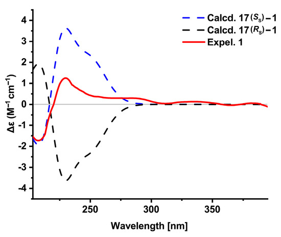 Experimental ECD spectrum of 1 and the calculated ECD spectra of (SS)-1 and (RS)-1.