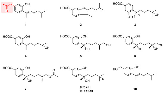 Fungi have been identified as a prolific source of secondary metabolites with effective properties of applications in pharmacy, food, and agriculture [5]. Specifically, in agronomy, many secondary metabolites exhibited significant antimicrobial activities against phytopathogens [6]. As clear examples, bioactive secondary metabolites produced by Metarhizium, Beauveria, and Trichoderma spp. have great potential in controlling phytopathogenic fungi, bacteria, and pests [7,8]. Marine-derived fungi, inhabiting special habitats such as high salinity, high pressure, absence of sunlight, and deficiency of nutrients, have been proved to be abundant sources of structurally unique and bioactive secondary metabolites for countering the biotic and abiotic stress [9,10]. The genus Aspergillus is prolific and ubiquitous in marine habitats, some of them could produce a variety of secondary metabolites with different structures, including polyketides, alkaloids, sterols, terpenoids, and peptides [11]. Many of these metabolites showed a wide range of bioactivities, such as antimicrobial, cytotoxic, insecticidal, and antioxidant activities [12]. During our ongoing efforts to search for new bioactive compounds from marine-derived fungi [13,14,15,16], a strain of A. sydowii LW09 isolated from a deep-sea sediment of the Southwest Indian Ridge was screened out for investigations. The EtOAc crude extract from the fermentation of this fungus showed antibacterial and antifungal activities. Bioassay-guided fractionation of this extract was performed, leading to the isolation of one new sulfoxide-containing phenolic bisabolane sesquiterpenoid aspersydosulfoxide A (1) and nine known analogues aspergillusene B (2), (−)-(R)-cyclo-hydroxysydonic acid (3), penicibisabolane G (4), (7S,11S)-(+)-12-hydroxysydonic acid (5), 11,12-dihydroxysydonic acid (6), expansol G (7), (S)-sydonic acid (8), aspergoterpenin C (9), and aspergillusene A (10). All the isolated compounds were tested for antibacterial activities against P. syringae and R. solanacarum, spore germination inhibition of F. oxysporum and A. alternata, and nematicidal activities against M. incognita J2s. Details of the isolation, structural elucidation, and bioactivities of these compounds are described herein.