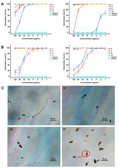 Phytopathogenic fungi F. oxysporum and A. alternata are typical soil-borne and air-borne pathogens which caused huge losses of crops annually [32,33], and spore germination is an essential part of their disease cycle. The isolated compounds 1–10 were evaluated for their antifungal activities against the phytopathogenic fungi F. oxysporum and A. alternata using spore germination tests. Compounds 1, 2, 3, 5, 7, and 8 could inhibit the spore germination of F. oxysporum in the concentration range of 128–32 μg/mL (Figure 5A). Compounds 3 and 7 inhibited the spore germination of F. oxysporum, with EC50 values 54.55 and 77.16 μg/mL, respectively (Table 3). Among the test compounds, compound 8 strongly inhibited the spore germination of F. oxysporum, with an EC50 value of 1.85 μg/mL (Table 3). Furthermore, compound 8 was not going into a plateau phase at 1 μg/mL according to the curve (Figure 5A), revealing that it could inhibit the spore germination of F. oxysporum at a lower concentration (<1 μg/mL). In addition, compounds 2, 3, 7, and 8 also showed good inhibition against A. alternata spore germination in the range of 128–32 μg/mL (Figure 5B), with EC50 values of 34.04, 44.44, 26.02, and 46.15 μg/mL, respectively (Table 3). Further investigations showed that the spore germ tubes of A. alternata were vacuolated with the treatment of compounds 2, 3, 7, and 8 (Figure 5C and Figure S10).