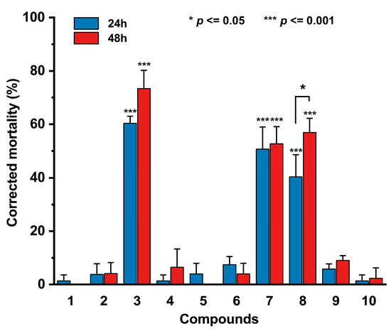 Corrected mortality of M. incongnita J2s treated with the tested compounds at 800 μg/mL. DMSO was used as negative control with the same concentration. Plotted are mean + standard deviations; each treatment set three replicates. Compounds 3, 7, and 8 represented statistically significant differences (the Tukey test, p ≤ 0.001) between active ones and inactive ones, and 8 represented significant differences between 24 h and 48 h treated procedures (the Tukey test, p ≤ 0.05).
