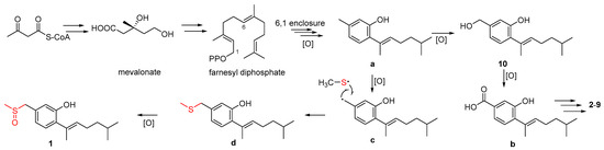 Biogenetically, the phenolic bisabolane skeleton (a) of compounds 1–10 could be derived from mevalonate-farnesyl diphophate-bisabolane pathway, as proposed in Scheme 1. The key intermediate a underwent an oxidation reaction to give 10. Oxidation of C-15 of 10 afforded benzoic acid derivative b, which further underwent a series of oxidation, cyclization, reduction, and esterification to yield compounds 2–10. In addition, the methylthio radical (CH3S•), possibly formed during the in vivo sulfur metabolism pathways, could be trapped by the methyl radical (H3C•), which could be generated by oxidation of benzyl of intermediate a, resulting in the production of methyl thioether d. The oxidation of methyl thioether d finally generated the methylsulfinyl bisabolane sesquiterpenoid 1.