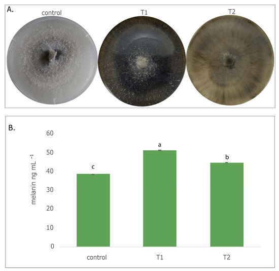 (A) Melanin fungal pigment production, (c) control, T1: Ultraviolet light (UV-A 320–400 nm) as inductor factor, T2: Temperature (30, 15 and 20 °C) as inductor factor. (B) Melanin concentrations (ng mL−1). Different letters denote significant difference (p ≤ 0.05).
