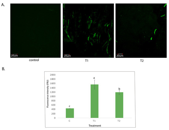 (A) Detection of reactive oxygen species (ROS) within Gaeumannomyces graminis hyphae staining with the oxidatively active fluorescent dye 2,7-dichlorodihydrofluorescein diacetate (H2DCFDA, Molecular Probes). (B) Fluorescence intensity expressed as FRU (Fluorescent Relative Unit). Different letters denote a significant difference (p < 0.05; Tukey test) between treatments. (c) control, T1: Stress condition under UV-A stress, T2: Stress condition due to temperature change (30, 15, and 20 °C).