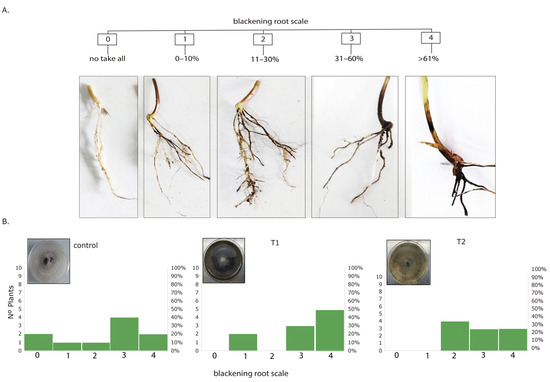 (A) Infection scale. 0: no take-all; 1: 1% to 10%; 2: 11% to 30%; 3: 31% to 60%; and 4: 61% to 100% of blackening roots, (B) Nº plants infected with take-all (blackening roots) according to infection scale after 60 days.