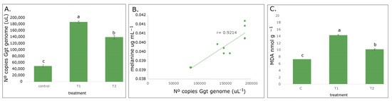 (A) Number of Ggt genome copies in infected roots 60 days after inoculation with 1% of Ggt. (B) Correlation between melanin concentration and Ggt genome copy number. (C) Lipid peroxidation measured as TBARS (thiobarbituric acid reactive substance) roots. (c) control, inducer factors T1: UV-A, T2: temperature variation (30, 15 and 20 °C). Different letters denote significant difference (p ≤ 0.05).