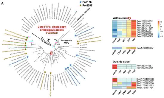 Unique expansion of some TFs, driven by ACs, may provide clues to host-specific adaptation. RNA-Seq data were previously described [24,25]. (A) Ftf1, the TF involved in tomato pathogenicity was most significantly expanded (10 copies of accessory FTFs) in the tomato pathogen Fol4287 genome and the expression of eight out of 10 were induced during plant colonization. (B) Ren1 was the most significantly expanded (seven copies of accessory RENs) in the Arabidopsis pathogen Fo5176 genome, and two of them were induced during plant colonization.