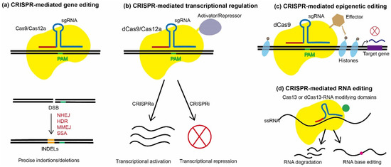 Diagram illustrating the mechanisms of representative CRISPR/Cas-based tools established in fungi. (a) CRISPR-mediated gene editing, where Cas9/Cas12a is guided to the target site with the aid of sgRNA and cleaves the target sequence, generating a double-stranded break (DSB). The DSB can be repaired via various repair pathways, including non-homologous end joining (NHEJ), homology-directed repair (HDR), microhomology-mediated end joining (MMEJ), and single-stranded DNA annealing (SSA). Various types of mutations, such as small indels, large deletions, or insertions, can be introduced at the DSB during the repairing process. (b) CRISPR-mediated transcriptional regulation, where deactivated Cas9/12a (dCas9/dCas12a) is fused with activation/repression domains, forming a complex that targets the promoter region of the target gene to activate or repress gene expression. CRISPRa: CRISPR-based activation; CRISPRi: inhibition. (c) CRISPR-mediated epigenetic editing, where dCas9 is fused with effectors, forming a complex for targeted histone modifications, impacts the expression level of the target gene. (d) CRISPR-mediated RNA editing uses Cas13, which has RNA-targeting activity to knockdown gene expression by triggering mRNA degradation, or uses an engineered dCas13-RNA-modifying domains-fusion protein for editing specific nucleotide residues. ssRNA: single-strand RNA; PAM: protospacer adjacent motif.