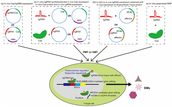 An overview of the application of CRISPR/Cas technology in fungi. The expression of Cas and gRNA can be achieved via several strategies. (a) In vivo expression of Cas and gRNA in the form of a plasmid or self-replicating AMA plasmid. (b) Cas and gRNA are expressed in a combined way, including in vitro synthesized gRNA and in vivo Cas expression, and in vitro Cas expression and in vivo gRNA expression. (c) CRISPR/dCas-based gene regulation and epigenetic editing, achieved via a gRNA/dCas–effector complex which is formed in vitro or in vivo expressed gRNA and a deactivated Cas (dCas)–effector fusion protein. (d) Cas and gRNA can both be expressed in vitro to form an RNP complex. An AMA plasmid is used for recycling selection markers. The major methods of genetic transformation for fungi include the protoplast-mediated transformation method and the Agrobacterium-mediated transformation method, Agrobacteria-mediated transformation [107]. Guided by gRNA, Cas nuclease induces DNA double-strand breaks (DSBs) at target sites. CRISPR/Cas-based gene editing can be achieved during the process of DSB repair via several DSB repair pathways, including non-homologous end joining (NHEJ), homologous recombination (HR) (dsDNA or ssDNA template is required), microhomology-mediated end joining (MMEJ), and single-strand annealing (SSA) (ssDNA template might be required) [36]. CRISPR/dCas systems are applied for gene expression regulation when dCas is fused to activator/repressor domains, or epigenetic editing when dCas is fused to epigenetic regulators [79]. Cas refers to CRISPR-associated proteins; dsDNA: double-strand DNA; ssDNA: single-strand DNA; BGCs: known as biosynthetic gene clusters, referring to the genomic regions that contain genes encoding enzymes regulating a metabolite biosynthesis pathway; SM: secondary metabolite.