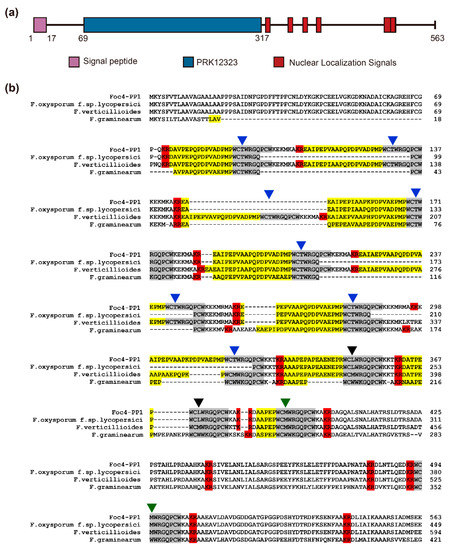 The Foc4-PP1 gene was first identified by RNA-seq profiling of banana roots infected with Foc TR4. The PP1 sequence (GenBank accession No. OQ425405) in Foc TR4 contains 1692 bp and encodes a protein of 563 amino acids with an N-terminal signal peptide (cleavage site between residues 17 and 18) (Figure 1a) but without a transmembrane structure or GPI-anchoring site. In addition, Foc4-PP1 contains six putative nuclear localization signals: 325PCWKKTK331, 355PCWKKTK361, 376PCWKAKR382, 396PCWKAKR402, 500PCWKAKR506, and 491KRWCMWRGQPCWKAKRA507 (Figure 1a). PSORT II prediction analysis indicated that Foc4 PP1 should have nuclear and cytoplasmic localization (Table S2).