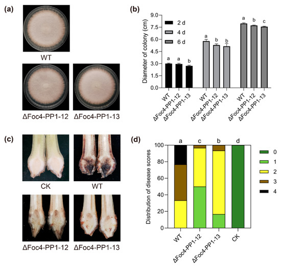 Foc4-PP1 contributes to the virulence of Foc TR4. (a) The colony morphologies of WT, ∆Foc4-PP1-12, and ∆Foc4-PP1-13 strains after growth on potato dextrose agar (PDA) plates for 6 d. (b) Colony diameters after growth for 2, 4, and 6 days. (c) Disease phenotype and (d) disease index distribution in banana plantlets inoculated with the WT, ∆Foc4-PP1-12, and ∆Foc4-PP1-13 strains at 28 days post inoculation. CK: banana plantlets inoculated with water; 0–4: different range of disease scores. Data presented in (b,d) are means ± SDs from three independent experiments. The values were analyzed with Duncan’s multiple range tests by SPSS. Columns with different letters indicate a significant difference (p < 0.05).