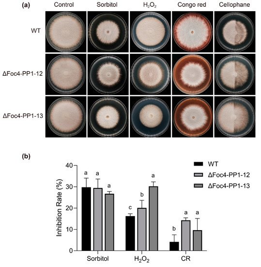 Sensitivity test of the WT and ΔFoc4-PP1 strains against abiotic stress. (a) Colony appearance of the WT, ∆Foc4-PP1-12, and ∆Foc4-PP1-13 strains on PDA plates supplemented with 1 M sorbitol, 25 mM H2O2, 200 μg/mL Congo red, and cellophane, respectively. Plates were incubated at 28 °C for six days after inoculation. (b) Quantification of colony size inhibition as appeared in (a). The strains cultured under non-stress conditions were used as controls. The inhibition ratio was calculated as the percentage growth reduction of the treated samples compared to the control. The values were analyzed with Duncan’s multiple range tests by SPSS. Columns with different letters indicate a significant difference (p < 0.05).