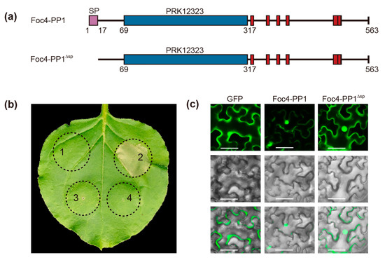 To investigate the influence of Foc4-PP1 on plant immunity, Foc4-PP1 and its signal peptide-deficient mutant (Foc4-PP1∆sp) were transiently expressed in N. benthamiana (Figure 4a). The expression of GFP and of a mammalian proapoptotic factor BAX were used as negative and positive controls. Twelve hours after the first inoculation, BAX-expressing Agrobacterium was applied at the same sites. The Bax protein is a member of the B-cell lymphoma-2 (BCL-2) family, which control the intrinsic apoptosis pathway [35]. The BAX-triggered cell death symptoms in N. benthamiana resembled the hypersensitive response by the plant immune system [36]. We found that Foc4-PP1 and Foc4-PP1∆sp did not induce cell death. Moreover, cell death triggered by BAX in the leaves co-expressing BAX and Foc4-PP1∆sp was almost completely suppressed (Figure 4b). These results indicate that Foc4-PP1∆sp could inhibit BAX-induced cell death, suggesting its role in the modulation of plant immunity.